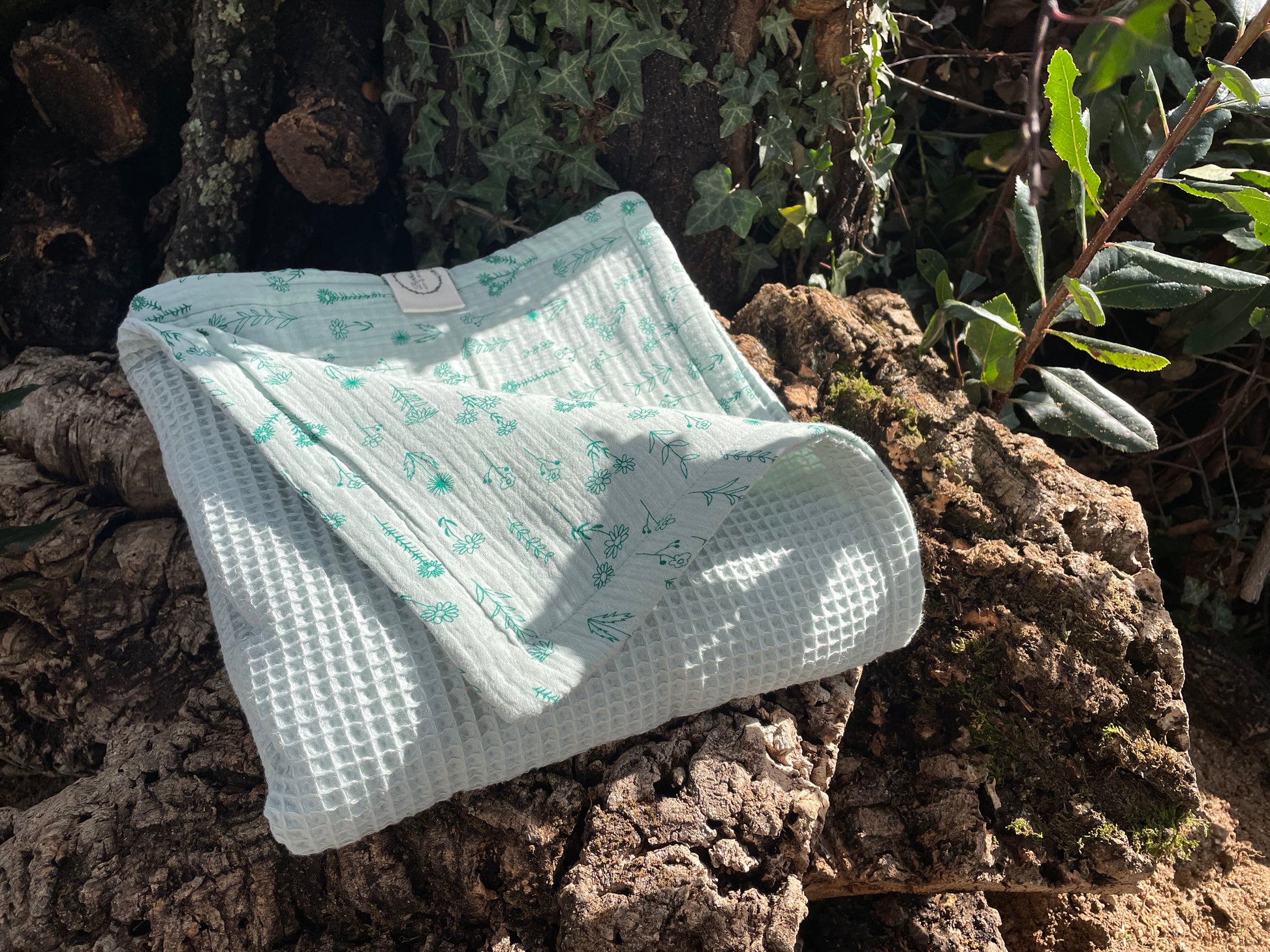 La parte exterior está confeccionada con tela Wafle Verde claro. La parte interna del Plaid, está confeccionado con tela Muselina color blanca con estampados de Flores Silvestres Verdes.
